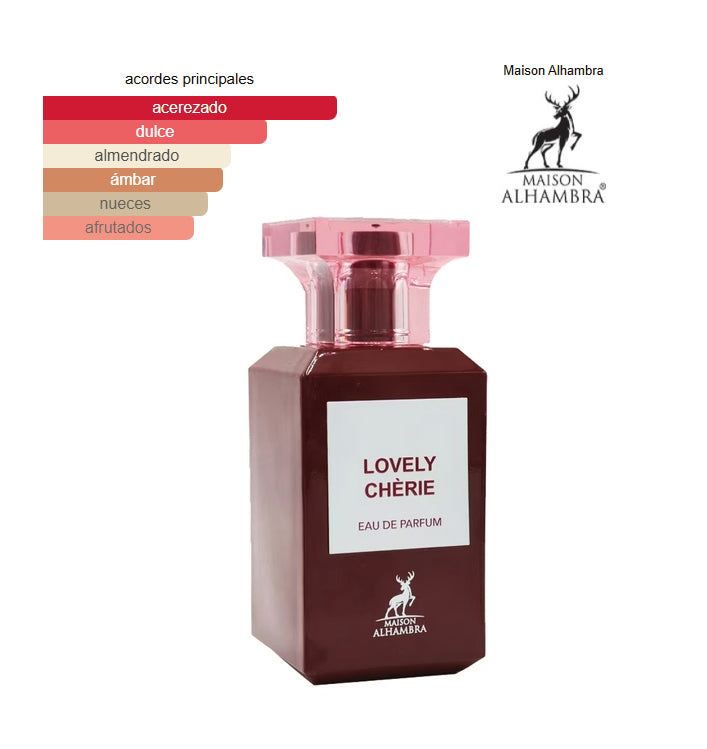 Lovely Chèrie de Maison Alhambra es una fragancia de la familia olfativa para Hombres y Mujeres. Las Notas de Salida son almendra amarga y rosa; las Notas de Corazón son cereza, Cereza negra y ámbar; las Notas de Fondo son haba tonka, tófe y bálsamo del Perú.