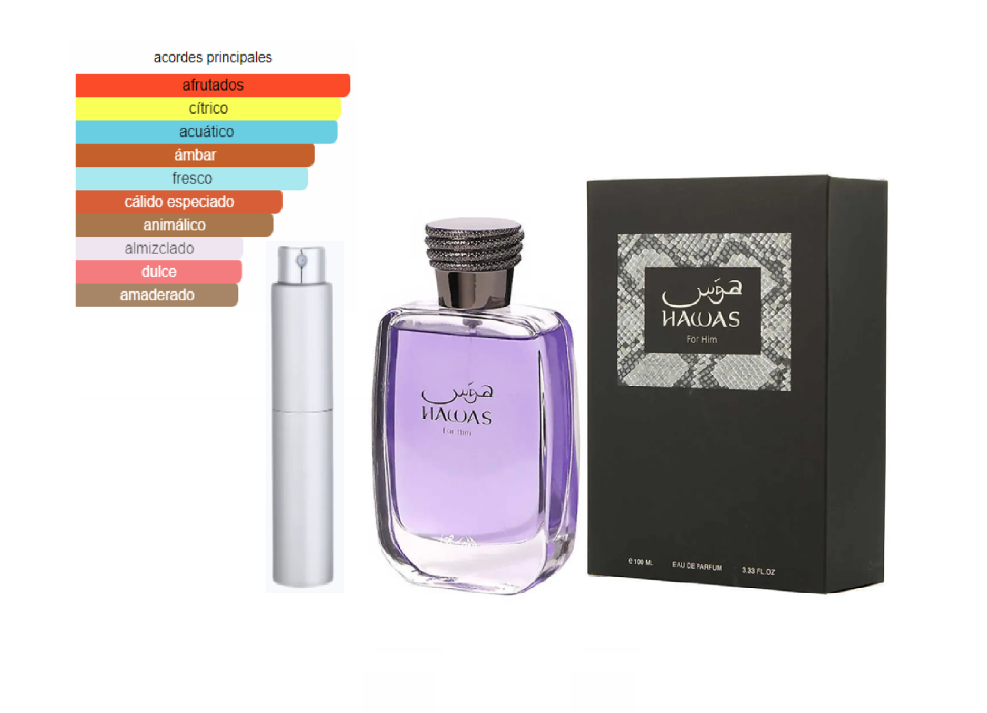 Rasasi Hawas Eau de Parfum es más que una fragancia, es una expresión de la modernidad y la audacia masculina. Con una transición suave desde las notas cítricas y afrutadas hacia un corazón floral, y finalmente hacia una base amaderada y muscosa.