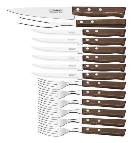 Sorprenda a sus invitados con un bello asado y toda la practicidad del juego de cubiertos para asado Tramontina de acero inoxidable con mango de madera natural, 14 piezas, de la línea Churrasco.